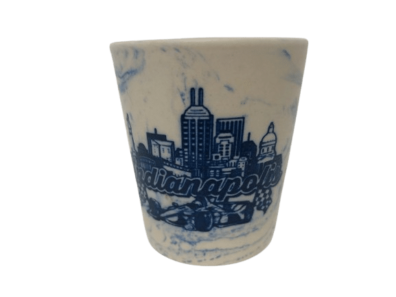This blue marble shot glass features the Indianapolis skyline, an Indy car, and 2 checkered flags.